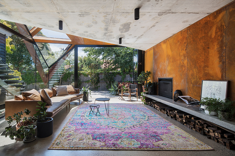 angular corten roof folds down over leaf house extension in melbourne